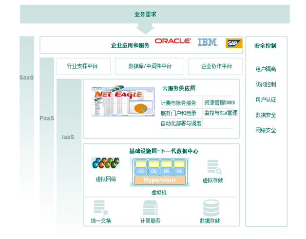 私有云(Private Clouds)是為一個企業(yè)單獨使用而構(gòu)建的,供自己內(nèi)部人員或分支機構(gòu)使用,相比于公有云、混合云,私有云能夠提供對數(shù)據(jù)、安全性和服務質(zhì)量的最有效控制。隨著大型企業(yè)數(shù)據(jù)中心的集中化,私有云將會成為部署IT系統(tǒng)的主流模式,成為云計算時代演進的一個重要過程。通過建立基礎架構(gòu)即服務的私有云計算平臺實現(xiàn)基礎設施層面的“IT即服務”。
